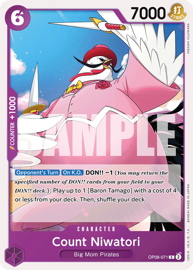 [Opponent's Turn] [On K.O.] DON!! −1 (You may return the specified number of DON!! cards from your field to your DON!! deck.): Play up to 1 [Baron Tamago] with a cost of 4 or less from your deck. Then, shuffle your deck.
