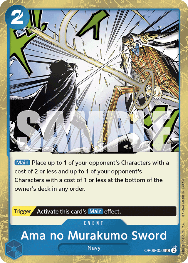 [Main] Place up to 1 of your opponent's Characters with a cost of 2 or less and up to 1 of your opponent's Characters with a cost of 1 or less at the bottom of the owner's deck in any order. [Trigger] Activate this card's [Main] effect.