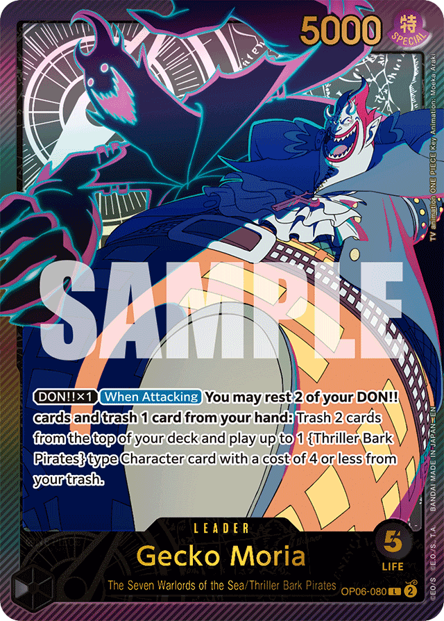 [DON!! x1] [When Attacking] You may rest 2 of your DON!! cards and trash 1 card from your hand: Trash 2 cards from the top of your deck and play up to 1 {Thriller Bark Pirates} type Character card with a cost of 4 or less from your trash.