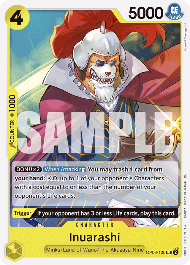 [DON!! x2] [When Attacking] You may trash 1 card from your hand: K.O. up to 1 of your opponent's Characters with a cost equal to or less than the number of your opponent's Life cards. [Trigger] If your opponent has 3 or less Life cards, play this card.