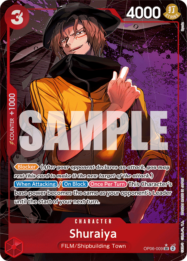 [Blocker] (After your opponent declares an attack, you may rest this card to make it the new target of the attack.) [When Attacking]/[On Block] [Once Per Turn] This Character's base power becomes the same as your opponent's Leader until the start of your next turn.