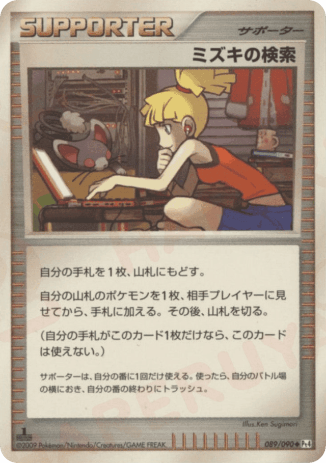自分の手札を1枚、山札にもどす。<br> 自分の山札のポケモンを1枚、相手プレイヤーに見せてから、手札に加える。その後、山札を切る。<br> (自分の手札がこのカード1枚だけなら、このカードは使えない。) サポートは、自分の番に1枚しか使えない。