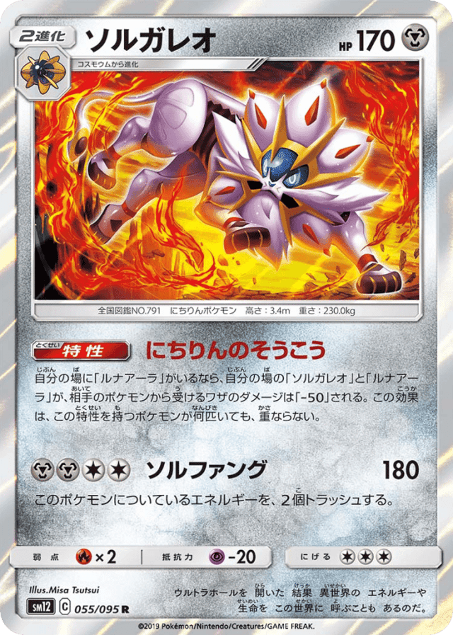 Armor of the Sunne自分の場に「ルナアーラ」がいるなら、自分の場の「ソルガレオ」と「ルナアーラ」が、相手のポケモンから受けるワザのダメージは「-50」される。この効果は、この特性を持つポケモンが何匹いても、重ならない。