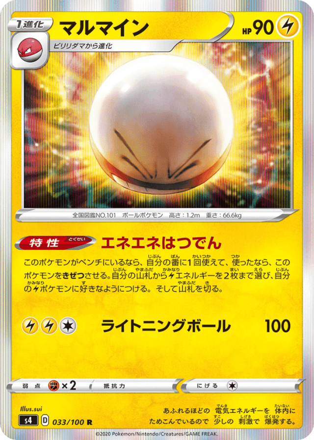 Buzzap Generatorこのポケモンがベンチにいるなら、自分の番に1回使えて、使ったなら、このポケモンをきぜつさせる。自分の山札からElectricポケモンに好きなようにつける。そして山札を切る。
