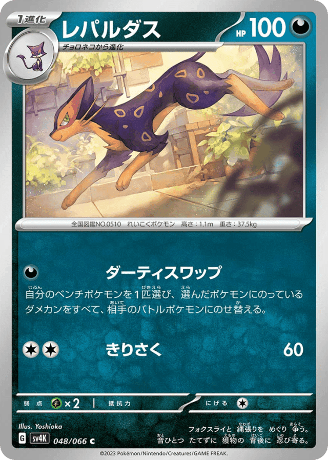 Dishonest SwapCost: 1自分のベンチポケモンを1匹選び、選んだポケモンにのっているダメカンをすべて、相手のバトルポケモンにのせ替える。