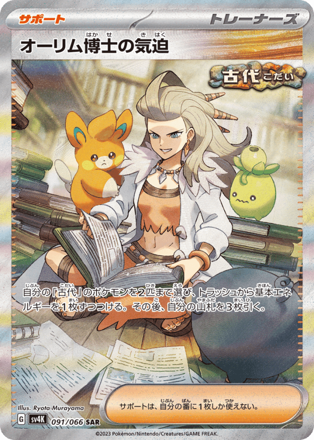 自分の「古代」のポケモンを2匹まで選び、トラッシュから基本エネルギーを1枚ずつつける。その後、自分の山札を3枚引く。 サポートは、自分の番に1枚しか使えない。