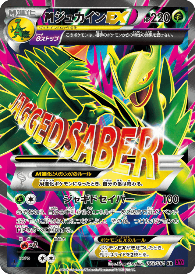 Jagged Saber100Cost: 2のぞむなら、自分の手札からGrassエネルギーを2枚まで選び、ベンチポケモンに好きなようにつけてよい。その後、つけたポケモンのHPをすべて回復する。
