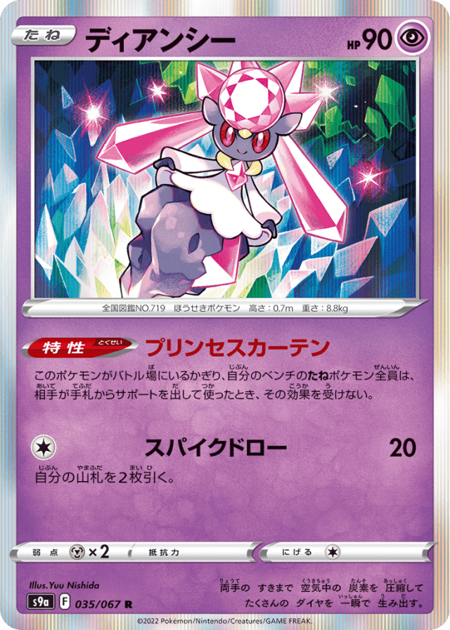 Princess Curtainこのポケモンがバトル場にいるかぎり、自分のベンチのたねポケモン全員は、相手が手札からサポートを出して使ったとき、その効果を受けない。