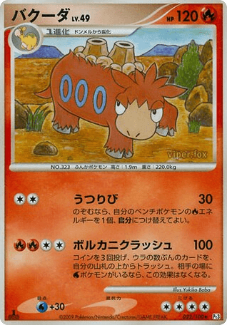 Volcanic Crash100Cost: 4コインを3回投げ、ウラの数ぶんのカードを、自分の山札の上からトラッシュ。相手の場にWaterポケモンがいるなら、この効果はなくなる。