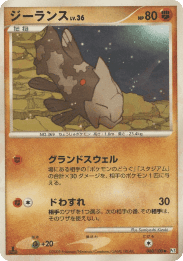 場にある相手の「ポケモンのどうぐ」「スタジアム」の合計×30ダメージを、相手のポケモン1匹に与える。
