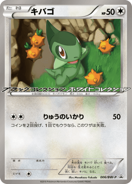 Black & White Promos is a Japanese promotional compilation associated with the Black & White era of the Pokémon Trading Card Game, listed under set ID bwp_ja and released in Japan in late 2010. It functions as a supplemental collection to the main Black & White expansions, compiling promotional cards issued across that period rather than a standard numbered set. Collectors can expect a varied assortment of promo prints, primarily Pokémon and Trainer cards, often featuring alternate artwork and special foil treatments typical of promotional releases. The set documents items distributed through events, product tie-ins, and other Japanese promotional channels during the Black & White era.