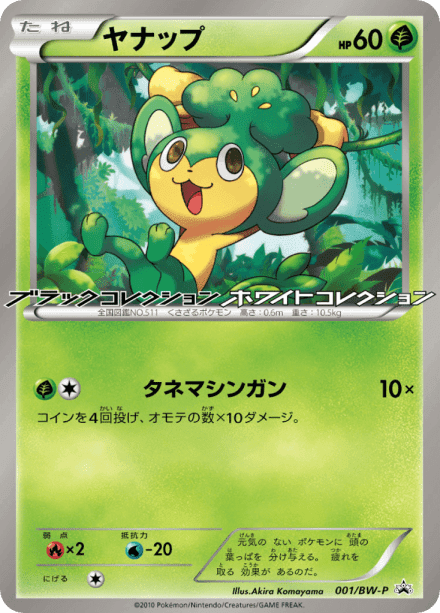 Black & White Promos is a Japanese promotional compilation associated with the Black & White era of the Pokémon Trading Card Game, listed under set ID bwp_ja and released in Japan in late 2010. It functions as a supplemental collection to the main Black & White expansions, compiling promotional cards issued across that period rather than a standard numbered set. Collectors can expect a varied assortment of promo prints, primarily Pokémon and Trainer cards, often featuring alternate artwork and special foil treatments typical of promotional releases. The set documents items distributed through events, product tie-ins, and other Japanese promotional channels during the Black & White era.