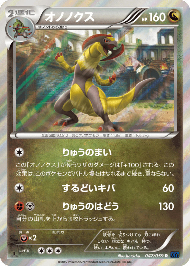 Dragon DanceCost: 1この「オノノクス」が使うワザのダメージは「+100」される。この効果は、このポケモンがバトル場をはなれるまで続き、重ならない。