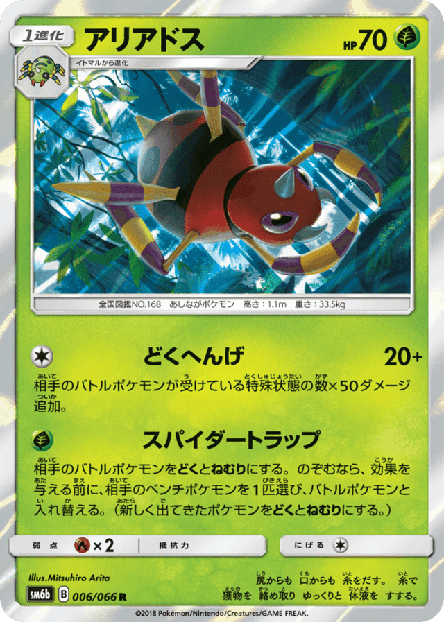 Spider TrapCost: 1相手のバトルポケモンをどくとねむりにする。のぞむなら、効果を与える前に、相手のベンチポケモンを1匹選び、バトルポケモンと入れ替える。(新しく出てきたポケモンをどくとねむりにする。)