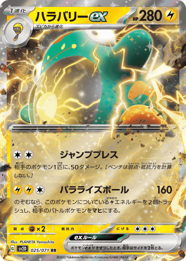 Paralyze Ball160Cost: 3のぞむなら、このポケモンについているElectricエネルギーを2個トラッシュし、相手のバトルポケモンをマヒにする。