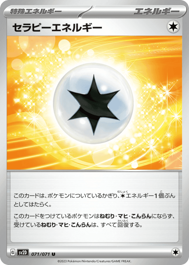 このカードは、ポケモンについているかぎり、Colorlessエネルギー1個ぶんとしてはたらく。 このカードをつけているポケモンはねむり・マヒ・こんらんにならず、受けているねむり・マヒ・こんらんは、すべて回復する。