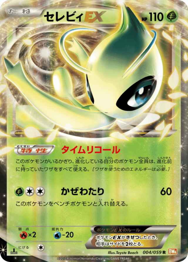 Time Recallこのポケモンがいるかぎり、進化している自分のポケモン全員は、進化前に持っていたワザをすべて使える。[ワザを使うためのエネルギーは必要。]