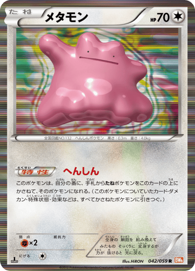 Transformこのポケモンは、自分の番に、手札からたねポケモンをこのカードの上にかさねて、そのポケモンになれる。(このポケモンについていたカード・ダメカン・特殊状態・効果などは、すべてかさねたポケモンに引きつぐ。)