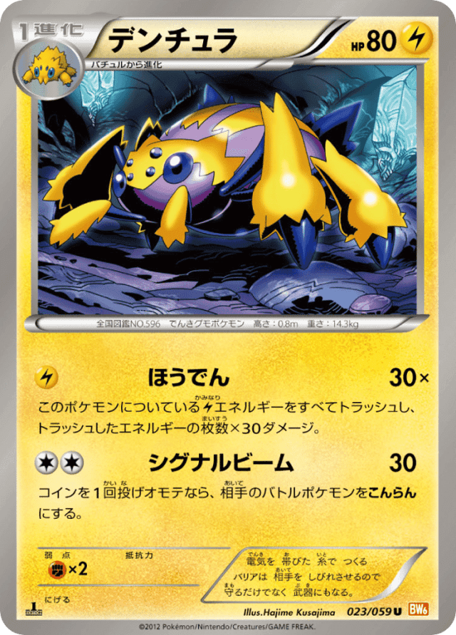 Discharge30×Cost: 1このポケモンについているElectricエネルギーをすべてトラッシュし、トラッシュしたエネルギーの枚数×30ダメージ。