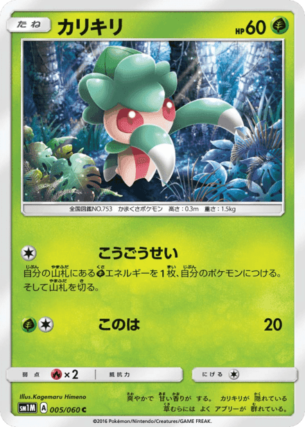 Collection Moon (コレクション ムーン) is a Japanese-language expansion of the Pokémon Trading Card Game released on December 9, 2016 as part of the Sun & Moon series and designated by the code SM1M. The set is catalogued with a total of 73 cards and a printed total of 60. As a Sun & Moon–era collection, it contains Japanese-language Pokémon and Trainer cards spanning the common rarities and print variants collectors expect from a themed collection release. Collectors typically look to this set for its region-specific Sun & Moon artwork, language-specific printings and any special or alternate-art cards included in the collection.