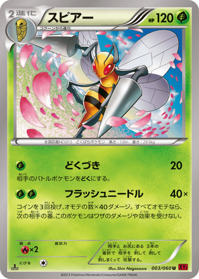 Flash Needle40×Cost: 2コインを3回投げ、オモテの数×40ダメージ。すべてオモテなら、次の相手の番、このポケモンはワザのダメージや効果を受けない。
