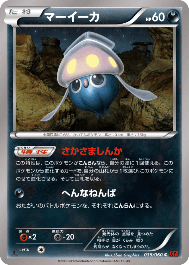 Upside-Down Evolutionこの特性は、このポケモンがこんらんなら、自分の番に1回使える。このポケモンから進化するカードを、自分の山札から1枚選び、このポケモンにのせて進化させる。そして山札を切る。