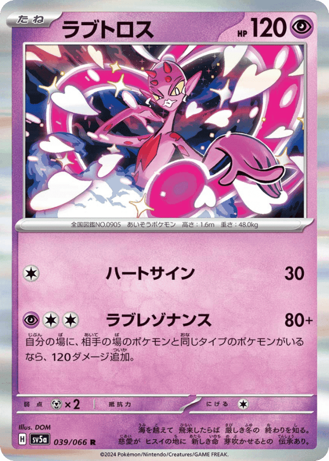 Love Resonance80+Cost: 3自分の場に、相手の場のポケモンと同じタイプのポケモンがいるなら、120ダメージ追加。