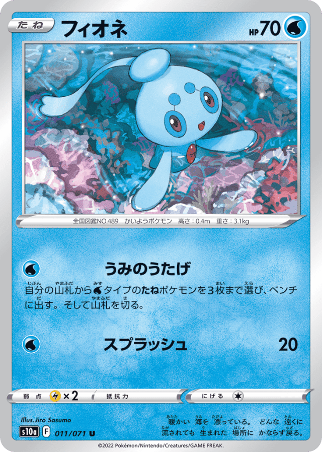 自分の山札からWaterタイプのたねポケモンを3枚まで選び、ベンチに出す。そして山札を切る。