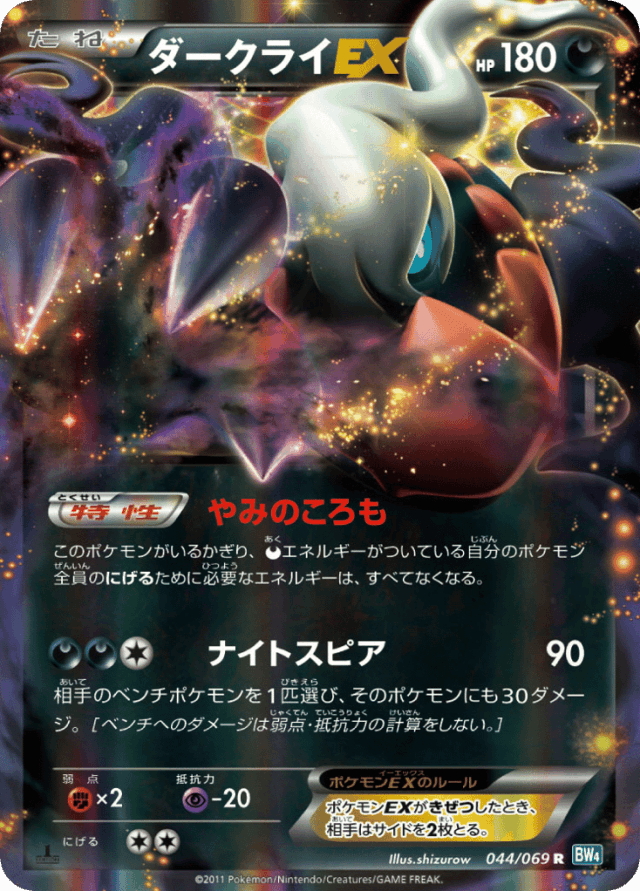 Dark Cloakこのポケモンがいるかぎり、Darknessエネルギーがついている自分のポケモン全員のにげるために必要なエネルギーは、すべてなくなる。