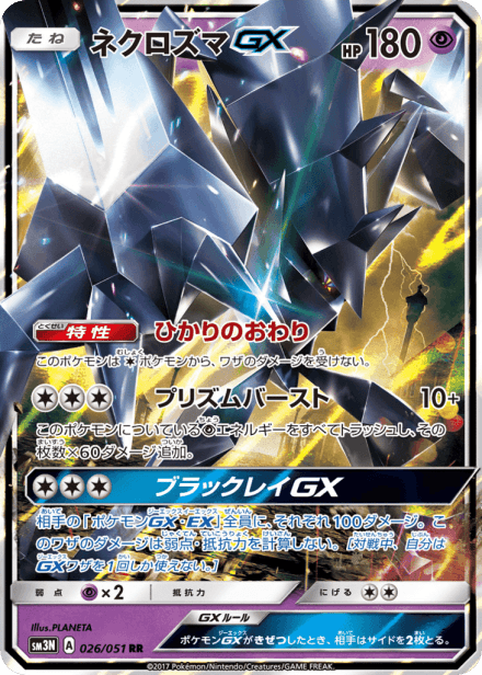 光を喰らう闇 (translated as "Darkness that Consumes Light") is a Japanese-language expansion in the Sun & Moon series of the Pokémon Trading Card Game released in Japan on June 16, 2017 and commonly referenced by the code SM3N. The set is listed with a total of 64 cards and a printed total of 51, indicating there are additional secret or special promotional cards beyond the regular printed index. Collectors typically find a standard mix of Pokémon, Trainer, and Energy cards in common, uncommon and rare rarities, along with the usual Sun & Moon-era special rarities such as holographic and secret/alternate-art cards. Thematically the expansion emphasizes darker-themed Pokémon and imagery suggested by its title, and is sought by collectors for its Japanese printings and any unique artwork or promo inclusions.