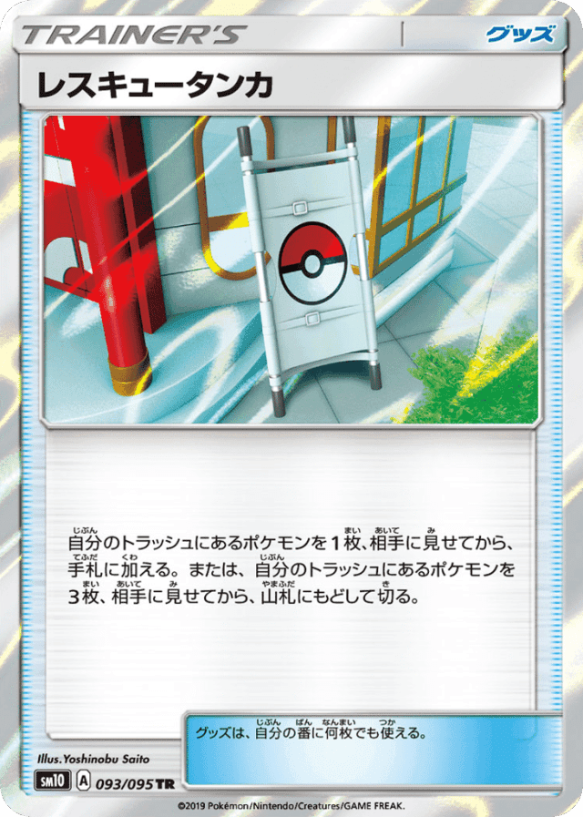 自分のトラッシュにあるポケモンを1枚、相手に見せてから、手札に加える。または、自分のトラッシュにあるポケモンを3枚、相手に見せてから、山札にもどして切る。 グッズは、自分の番に何枚でも使える。