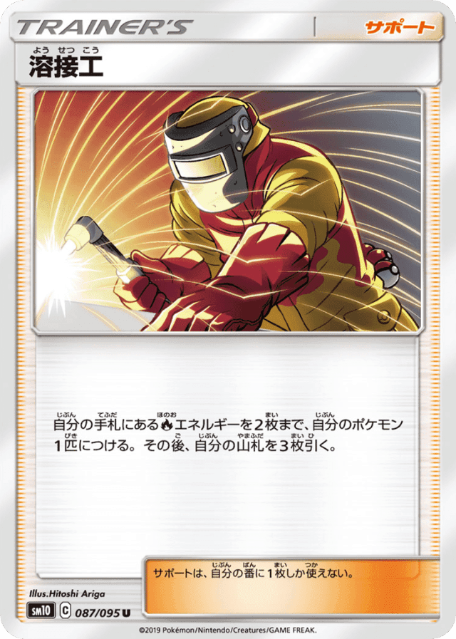自分の手札にあるFireエネルギーを2枚まで、自分のポケモン1匹につける。その後、自分の山札を3枚引く。 サポートは、自分の番に1枚しか使えない。