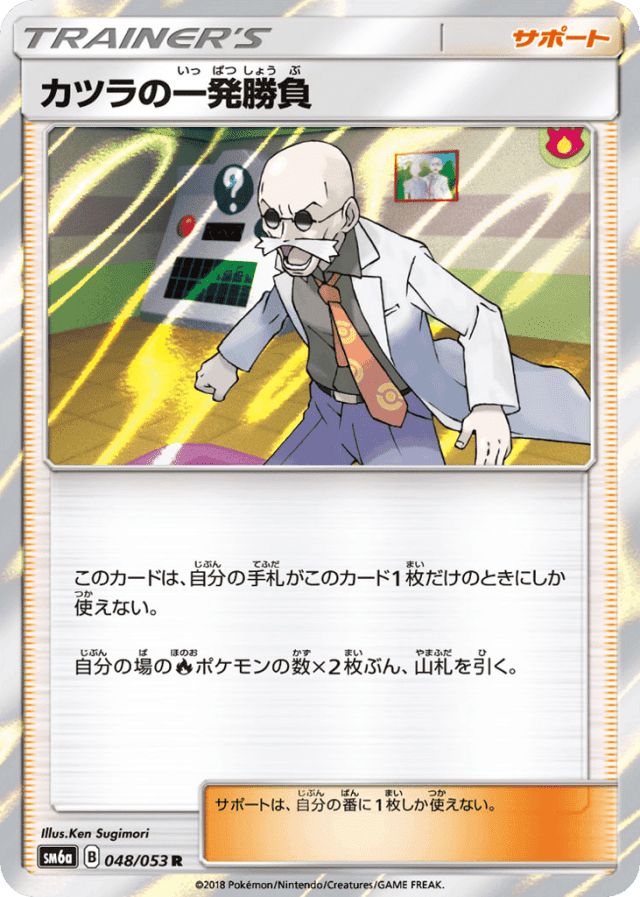 このカードは、自分の手札がこのカード1枚だけのときにしか使えない。 自分の場のFireポケモンの数×2枚ぶん、山札を引く。 サポートは、自分の番に1枚しか使えない。