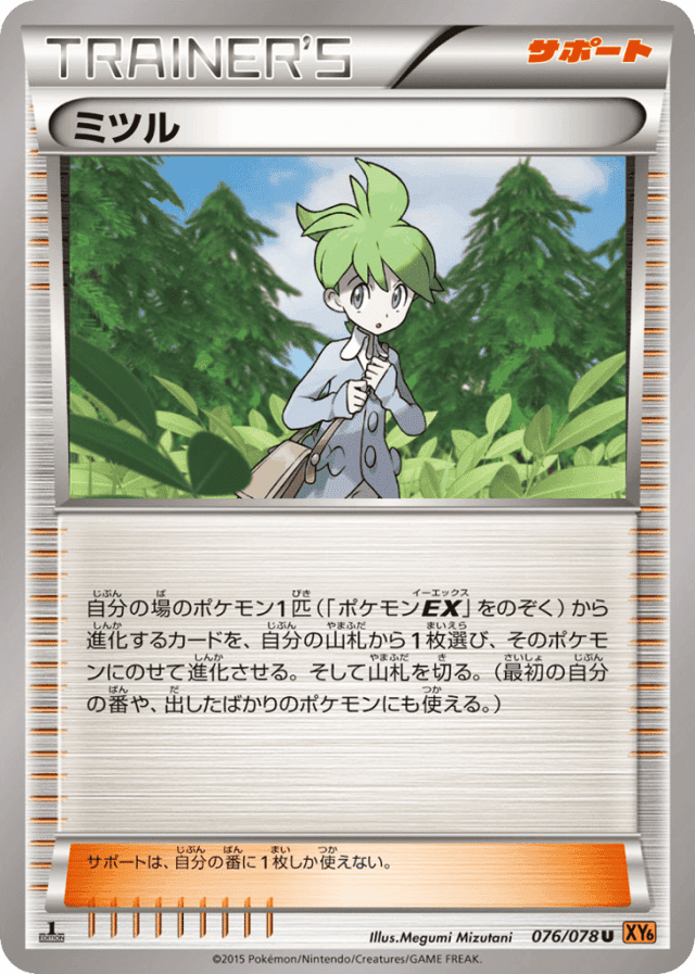 自分の場のポケモン1匹(「ポケモンEX」をのぞく)から進化するカードを、自分の山札から1枚選び、そのポケモンにのせて進化させる。そして山札を切る。(最初の自分の番や、出したばかりのポケモンにも使える。) サポートは、自分の番に1枚しか使えない。