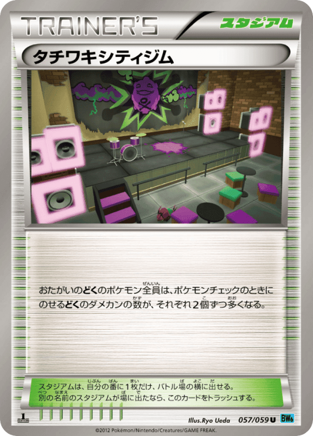 おたがいのどくのポケモン全員は、ポケモンチェックのときにのせるどくのダメカンの数が、それぞれ2個ずつ多くなる。 スタジアムは、自分の番に1枚だけ、バトル場の横に出せる。別の名前のスタジアムが場に出たなら、このカードをトラッシュする。