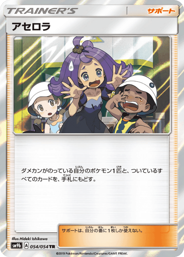 ダメカンがのっている自分のポケモン1匹と、ついているすべてのカードを、手札にもどす。 サポートは、自分の番に1枚しか使えない。