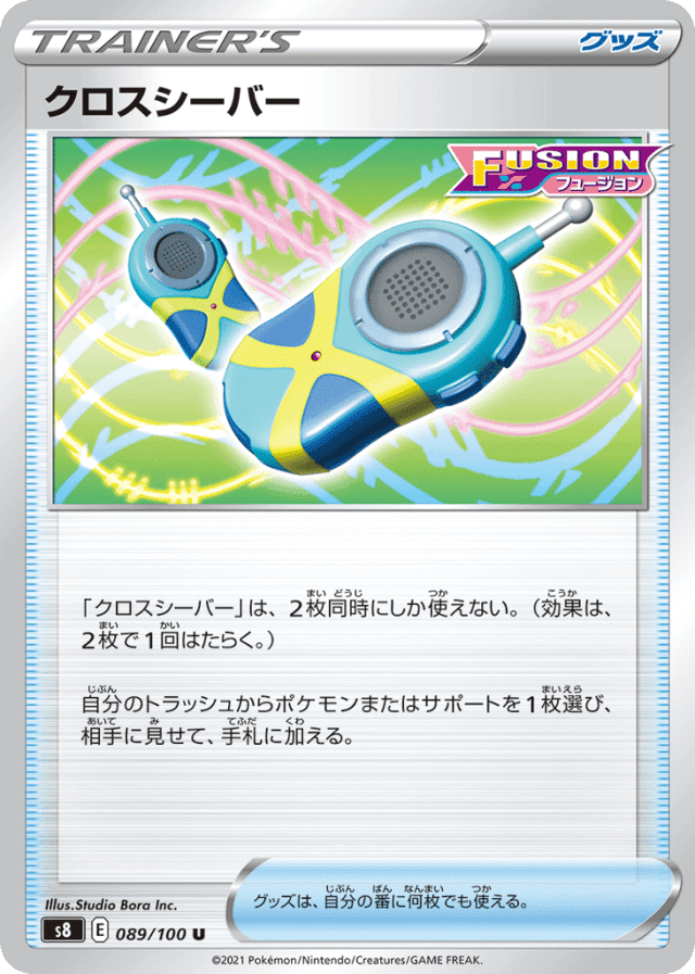 「クロスシーバー」は、2枚同時にしか使えない。(効果は、2枚で1回はたらく。) 自分のトラッシュからポケモンまたはサポートを1枚選び、相手に見せて、手札に加える。 グッズは、自分の番に何枚でも使える。