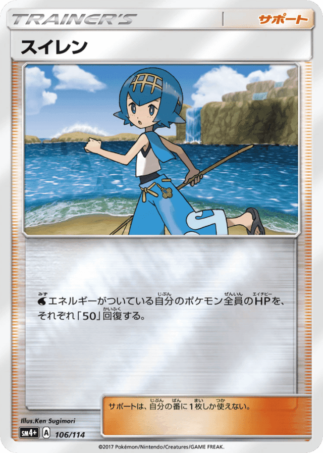 Waterエネルギーがついている自分のポケモン全員のHPを、それぞれ「50」回復する。 サポートは、自分の番に1枚しか使えない。