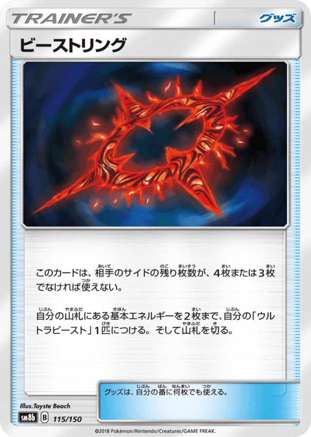 このカードは、相手のサイドの残り枚数が、4枚または3枚でなければ使えない。 自分の山札にある基本エネルギーを2枚まで、自分の「ウルトラビースト」1匹につける。そして山札を切る。 グッズは、自分の番に何枚でも使える。