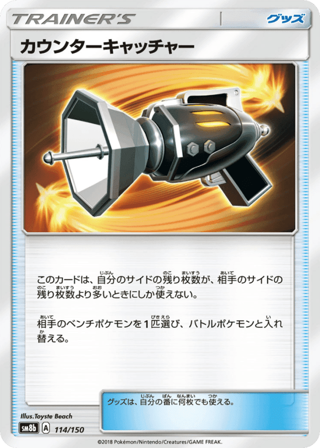 このカードは、自分のサイドの残り枚数が、相手のサイドの残り枚数より多いときにしか使えない。 相手のベンチポケモンを1匹選び、バトルポケモンと入れ替える。 グッズは、自分の番に何枚でも使える。