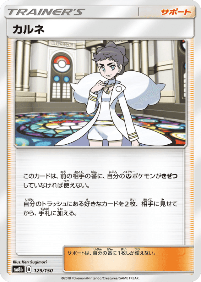 このカードは、前の相手の番に、自分のFairyポケモンがきぜつしていなければ使えない。 自分のトラッシュにある好きなカードを2枚、相手に見せてから、手札に加える。 サポートは、自分の番に1枚しか使えない。