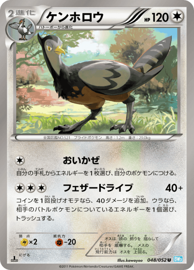 Feather Strike40+Cost: 3コインを1回投げオモテなら、40ダメージを追加。ウラなら、相手のバトルポケモンについているエネルギーを1個選び、トラッシュする。