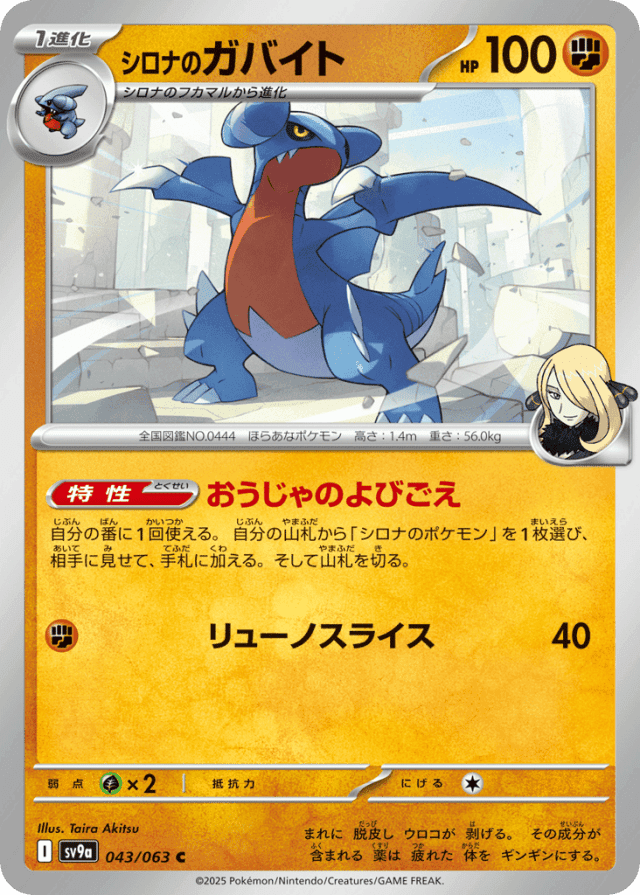 自分の番に1回使える。自分の山札から「シロナのポケモン」を1枚選び、相手に見せて、手札に加える。そして山札を切る。