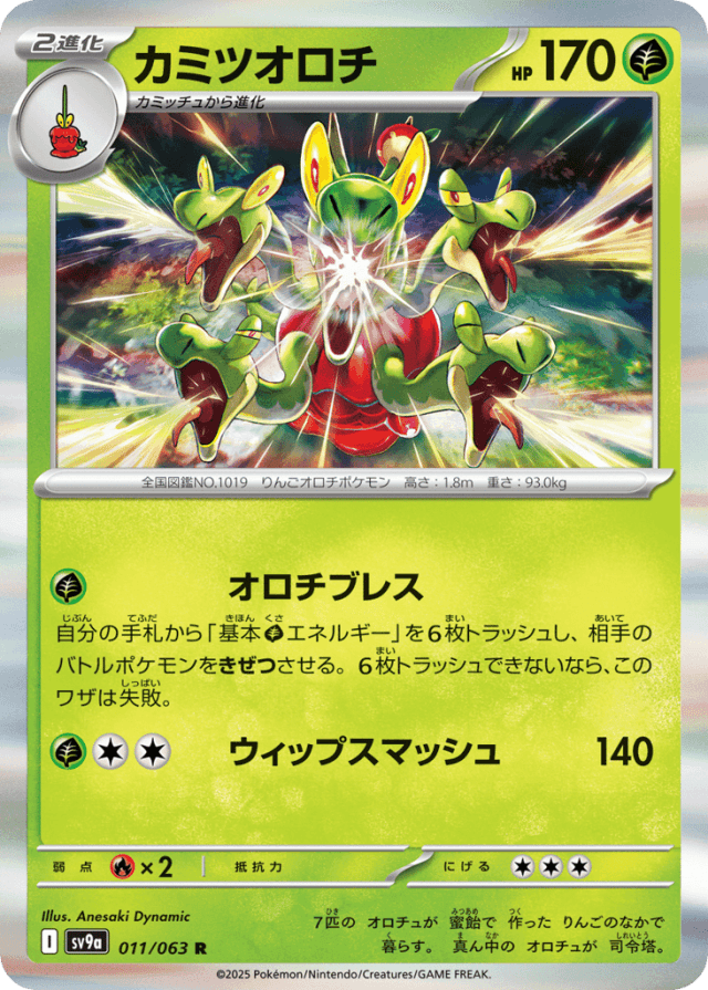 Hydra BreathCost: 1自分の手札から「基本Grassエネルギー」を6枚トラッシュし、相手のバトルポケモンをきぜつさせる。6枚トラッシュできないなら、このワザは失敗。