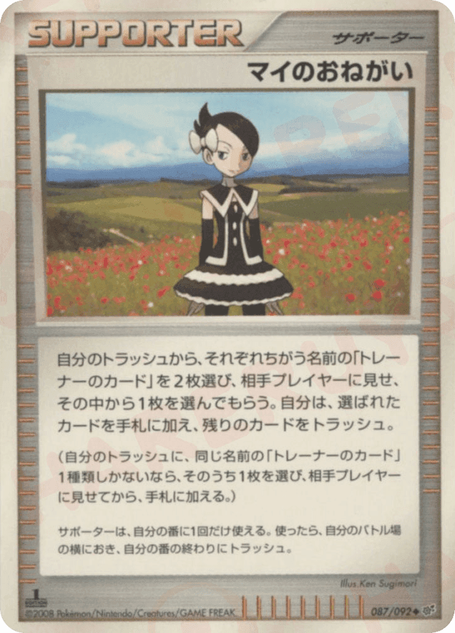 自分のトラッシュから、それぞれちがう名前の「トレーナーのカード」を2枚選び、相手プレイヤーに見せ、その中から1枚を選んでもらう。自分は、選ばれたカードを手札に加え、残りのカードをトラッシュ。<br> (自分のトラッシュに、同じ名前の「トレーナーのカード」1種類しかないなら、そのうち1枚を選び、相手プレイヤーに見せてから、手札に加える。) サポートは、自分の番に1枚しか使えない。