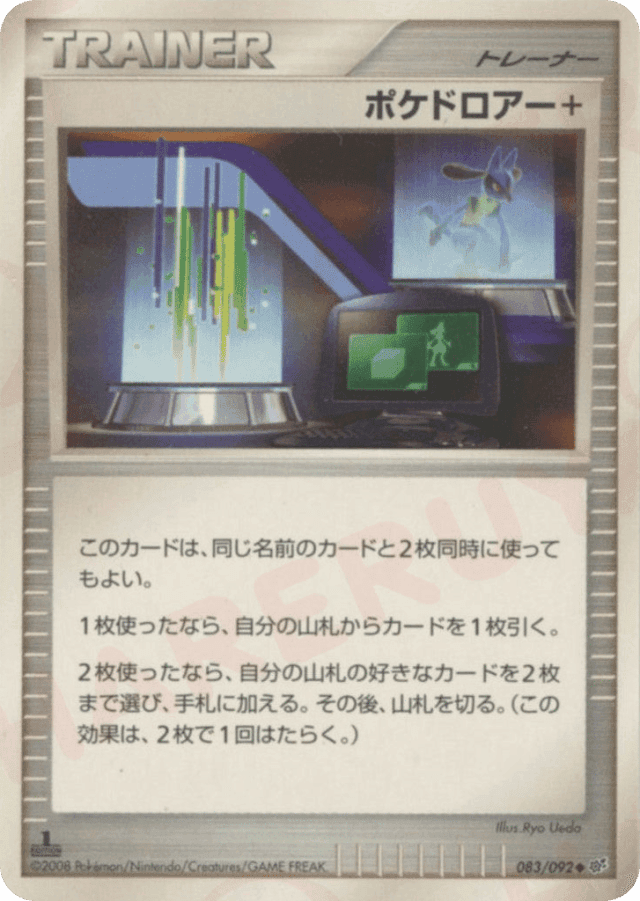 このカードは、同じ名前のカードと2枚同時に使ってもよい。<br> 1枚使ったなら、自分の山札からカードを1枚引く。<br> 2枚使ったなら、自分の山札の好きなカードを2枚まで選び、手札に加える。その後、山札を切る。(この効果は、2枚で1回はたらく。) グッズは、自分の番に何枚でも使える。