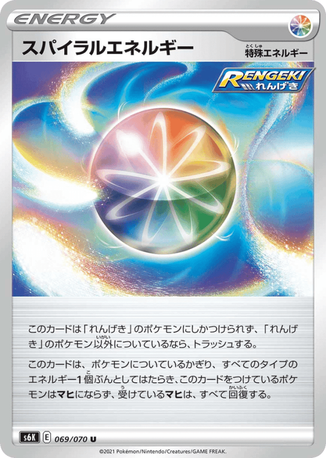このカードは「れんげき」のポケモンにしかつけられず、「れんげき」のポケモン以外についているなら、トラッシュする。 このカードは、ポケモンについているかぎり、すべてのタイプのエネルギー1個ぶんとしてはたらき、このカードをつけているポケモンはマヒにならず、受けているマヒは、すべて回復する。