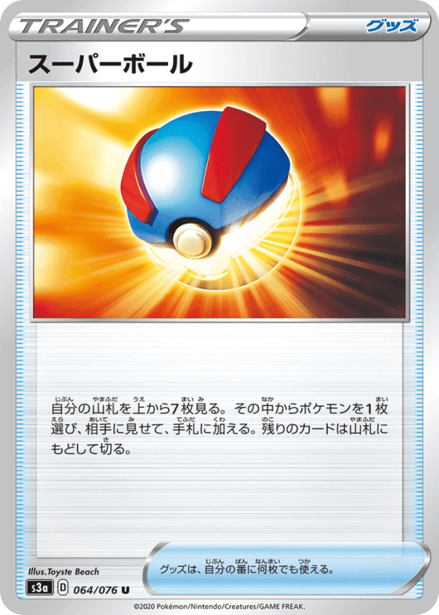 自分の山札を上から7枚見る。その中からポケモンを1枚選び、相手に見せて、手札に加える。残りのカードは山札にもどして切る。 グッズは、自分の番に何枚でも使える。