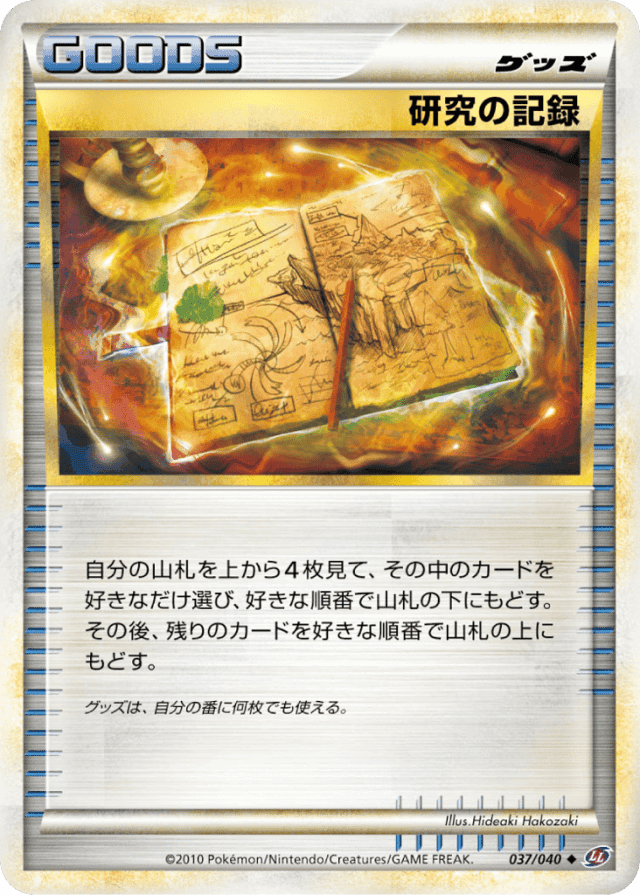 自分の山札を上から4枚見て、その中のカードを好きなだけ選び、好きな順番で山札の下にもどす。その後、残りのカードを好きな順番で山札の上にもどす。 グッズは、自分の番に何枚でも使える。