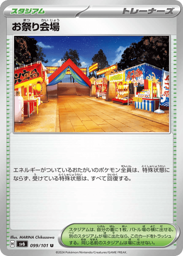 エネルギーがついているおたがいのポケモン全員は、特殊状態にならず、受けている特殊状態は、すべて回復する。 スタジアムは、自分の番に1枚だけ、バトル場の横に出せる。別の名前のスタジアムが場に出たなら、このカードをトラッシュする。